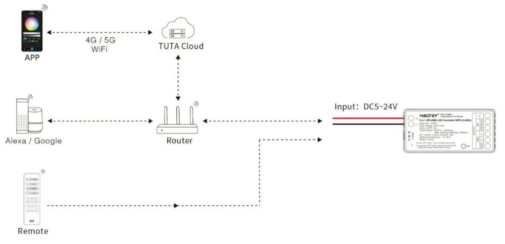 Podpora WiFi + RF 2,4 GHz bezdrôtovej komunikácie – ovládanie cez mobilnú aplikáciu (napr. Tuya Smart, MiBoxer) alebo RF ovládač do 30 m.