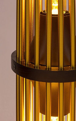 Konštrukcia je kovová, stabilná a odolná. Tienidlo je tvorené z medených kovových tyčiek usporiadaných do valcovitého tvaru, čo vytvára zaujímavý svetelný efekt. V lampe sú dve pätice E27, ktoré umožňujú osadiť bežne dostupné žiarovky – odporúčajú sa dekoratívne filamentové žiarovky pre ešte pôsobivejší vzhľad.