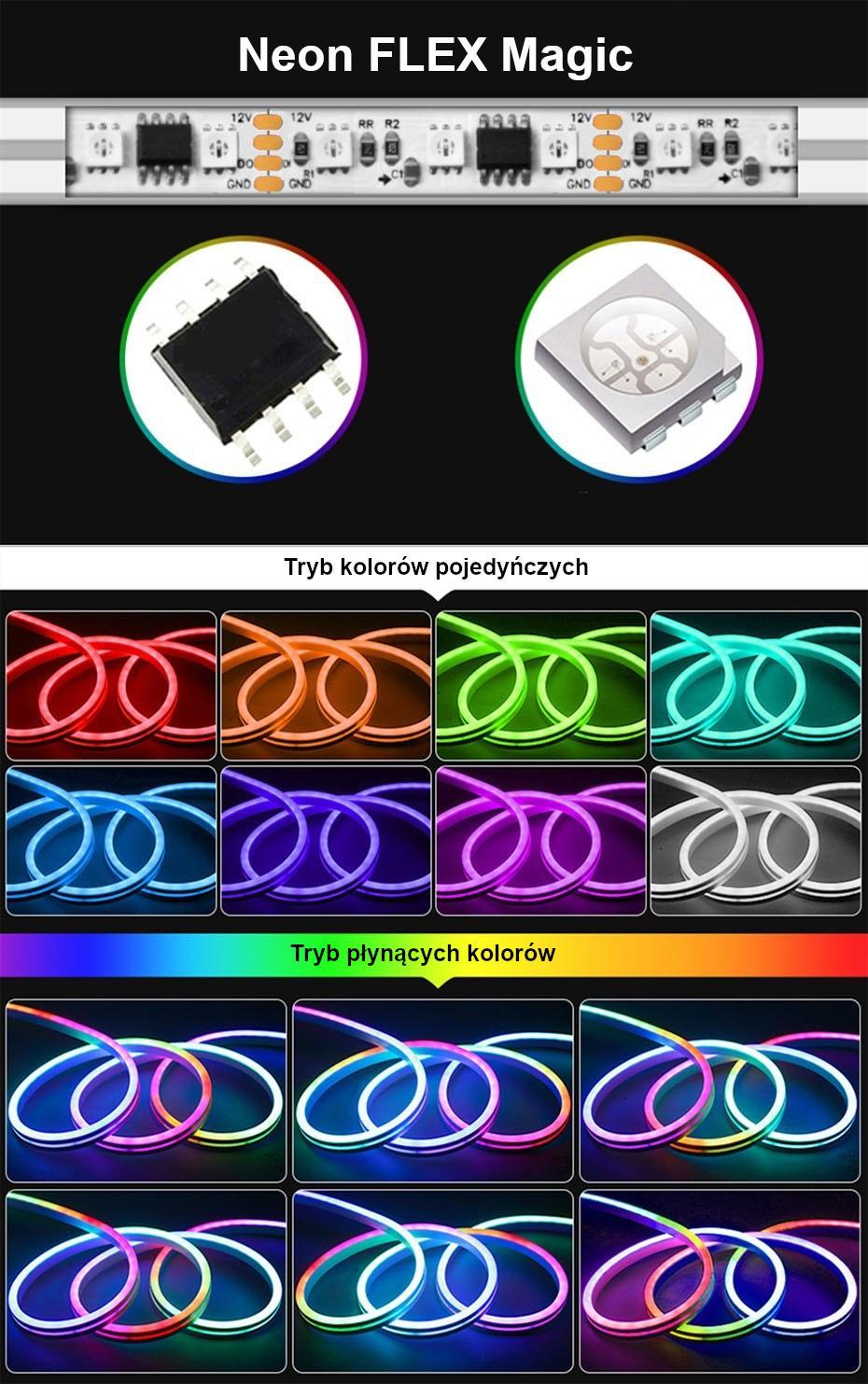 Digitálny LED neónový pás NEON-6/12-RGB-IC DIGITAL predstavuje moderné osvetlenie s vysokou flexibilitou, rovnomerným svetlom a možnosťou dynamických svetelných efektov. Vďaka riadiacemu čipu WS2811 je možné ovládať jednotlivé segmenty pásu samostatne, čo umožňuje vytvárať farebné prechody, animácie, pulzovanie či adresovateľné vzory. Tento typ LED neónu je ideálny pre profesionálne dekorácie, reklamné nápisy, ambientné nasvietenie interiéru aj exteriéru a kreatívne svetelné inštalácie.