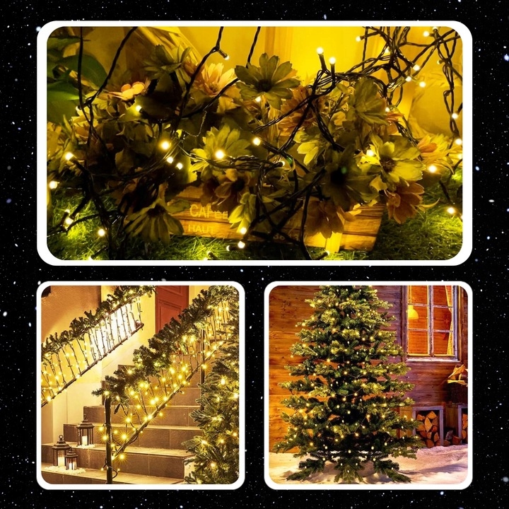 Teplá biela farba svetla dodáva okoliu príjemnú, zlatistú žiaru – perfektnú pre vianočné stromčeky, záhrady, terasy, altánky, pergoly, balkóny či zimné dekorácie. Reťaz má 8 režimov svietenia, medzi ktorými si môžete vybrať ten, ktorý najlepšie podčiarkne vianočnú náladu – od jemného blikania až po stále svetlo.