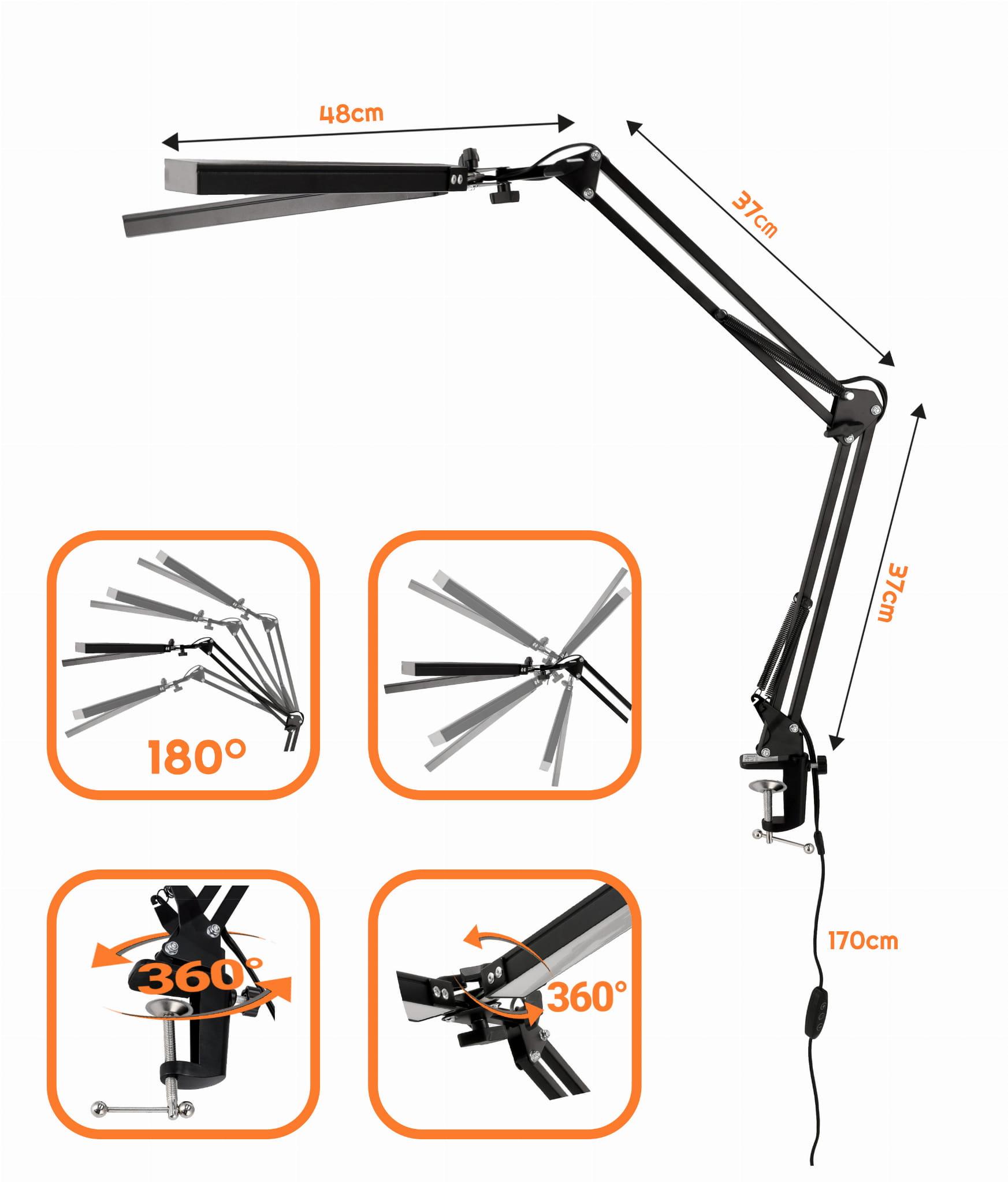 Lampa je navrhnutá s dôrazom na ergonómiu, funkčnosť a úsporu priestoru. Jej štíhly trojosový dizajn nezaberá veľa miesta na stole, čím ponecháva viac priestoru na prácu a ostatné predmety. Kovové výkyvné rameno umožňuje nastavenie až do uhla 270°, vďaka čomu si svetlo presne nasmerujete tam, kde ho potrebujete.