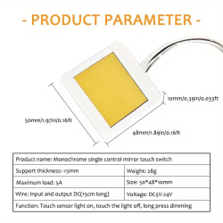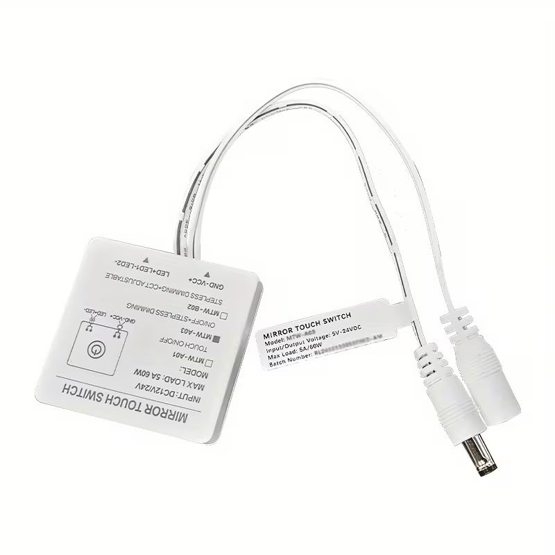 Spínač je určený pre jednofarebné LED osvetlenie s napájaním v rozsahu 5–24V DC. Podporuje zapnutie, vypnutie aj plynulé stmievanie svetla dlhým dotykom. Je vhodný najmä pre kúpeľňové zrkadlá s LED podsvietením, kozmetické zrkadlá, nábytkové osvetlenie alebo dekoratívne LED inštalácie.
