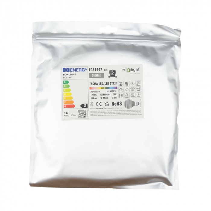 Pásik je vybavený integrovaným riadiacim čipom WS2814, ktorý umožňuje individuálne digitálne ovládanie segmentov. To znamená, že môžete vytvárať dynamické svetelné efekty, plynulé farebné prechody, animácie alebo svetelné scény presne podľa vašich predstáv. Kombinácia RGB farieb a neutrálnej bielej (4000K) poskytuje široké možnosti využitia – od dekoratívneho osvetlenia až po funkčné nasvietenie priestoru.
