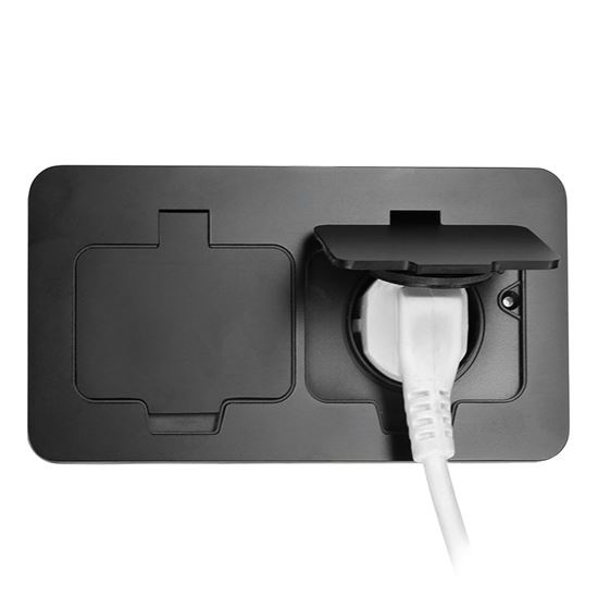 Zásuvka je vybavená detskou poistkou, ktorá zvyšuje bezpečnosť najmä v domácnostiach s deťmi. Viečka sa otvárajú až do uhla 130°, čo zabezpečuje pohodlné pripojenie zariadení bez namáhania pántov alebo rizika poškodenia. Automatické zatváranie pomocou pružiny zaručuje, že zásuvka zostane vždy bezpečne uzavretá.