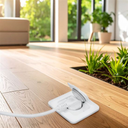 Zásuvka je navrhnutá tak, aby bola nenápadná, no zároveň vždy poruke. Po zatvorení viečka splýva s povrchom podlahy, steny alebo nábytku, čím vytvára čistý a profesionálny vzhľad priestoru.